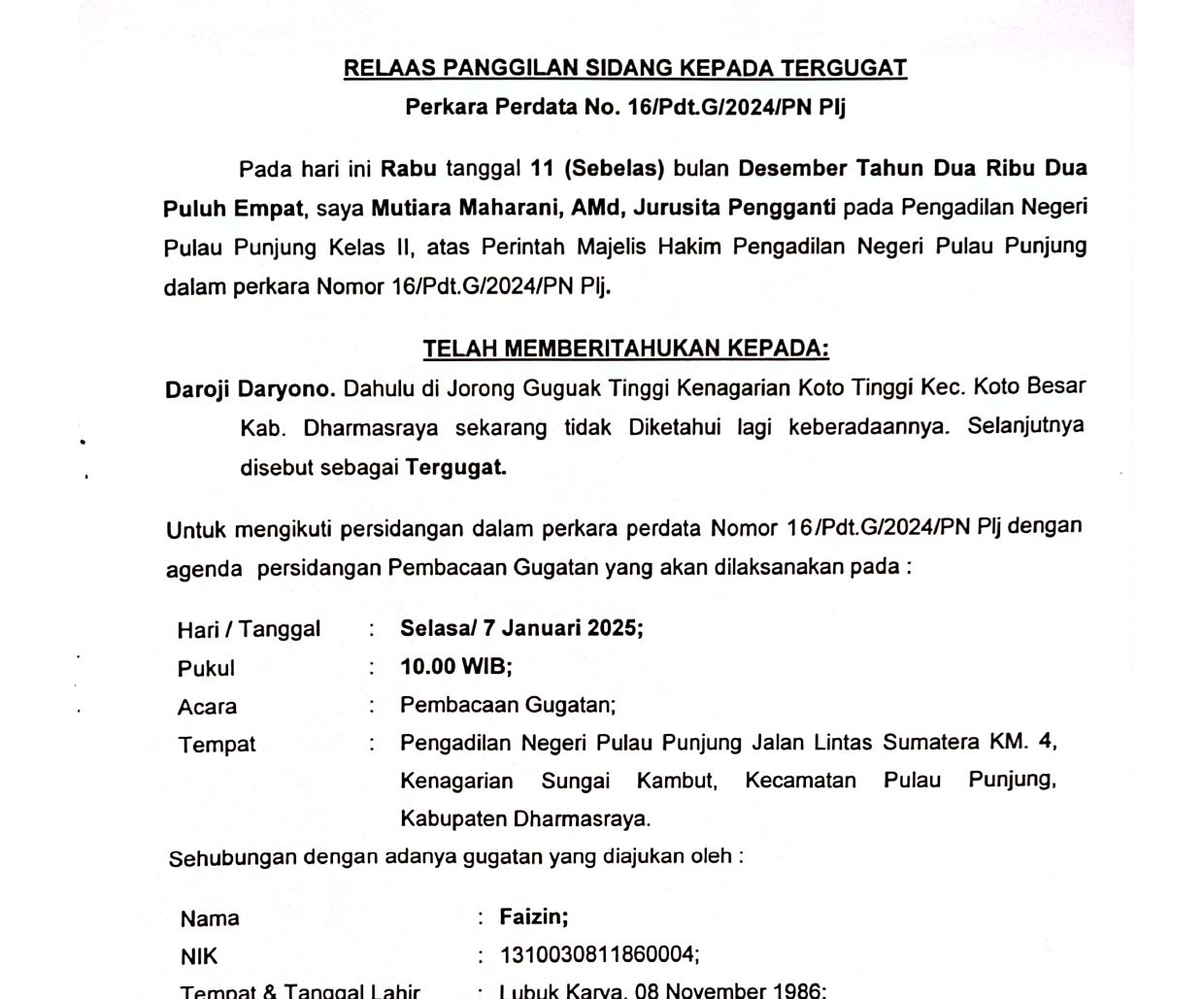 RELAAS PANGGILAN SIDANG KEPADA TERGUGAT ATAS NAMA DAROJI DARYONO 17 Desember 202417 Desember 2024Admin R Selengkapnya..
