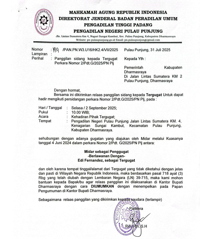 Panggilan Sidang Kepada Tergugat Atas Nama Edi Fernandez Perkara Nomor 2/Pdt.G/2025/PN Plj 13 Agustus 202513 Agustus 2025Admin R Selengkapnya..