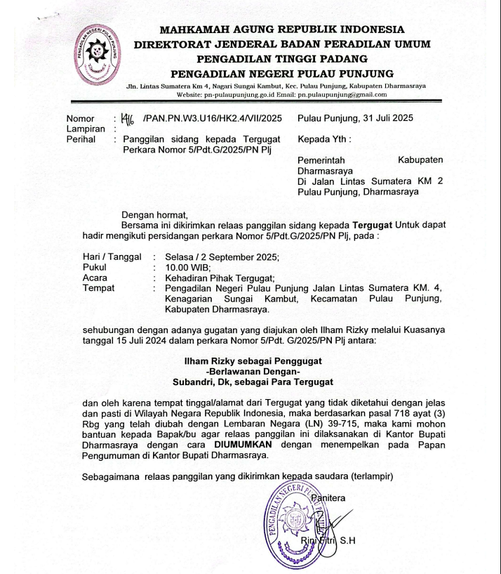 Panggilan Sidang Kepada Tergugat Atas Nama Subandri Perkara Nomor 5/Pdt.G/2025/PN Plj 13 Agustus 202513 Agustus 2025Admin R Selengkapnya..
