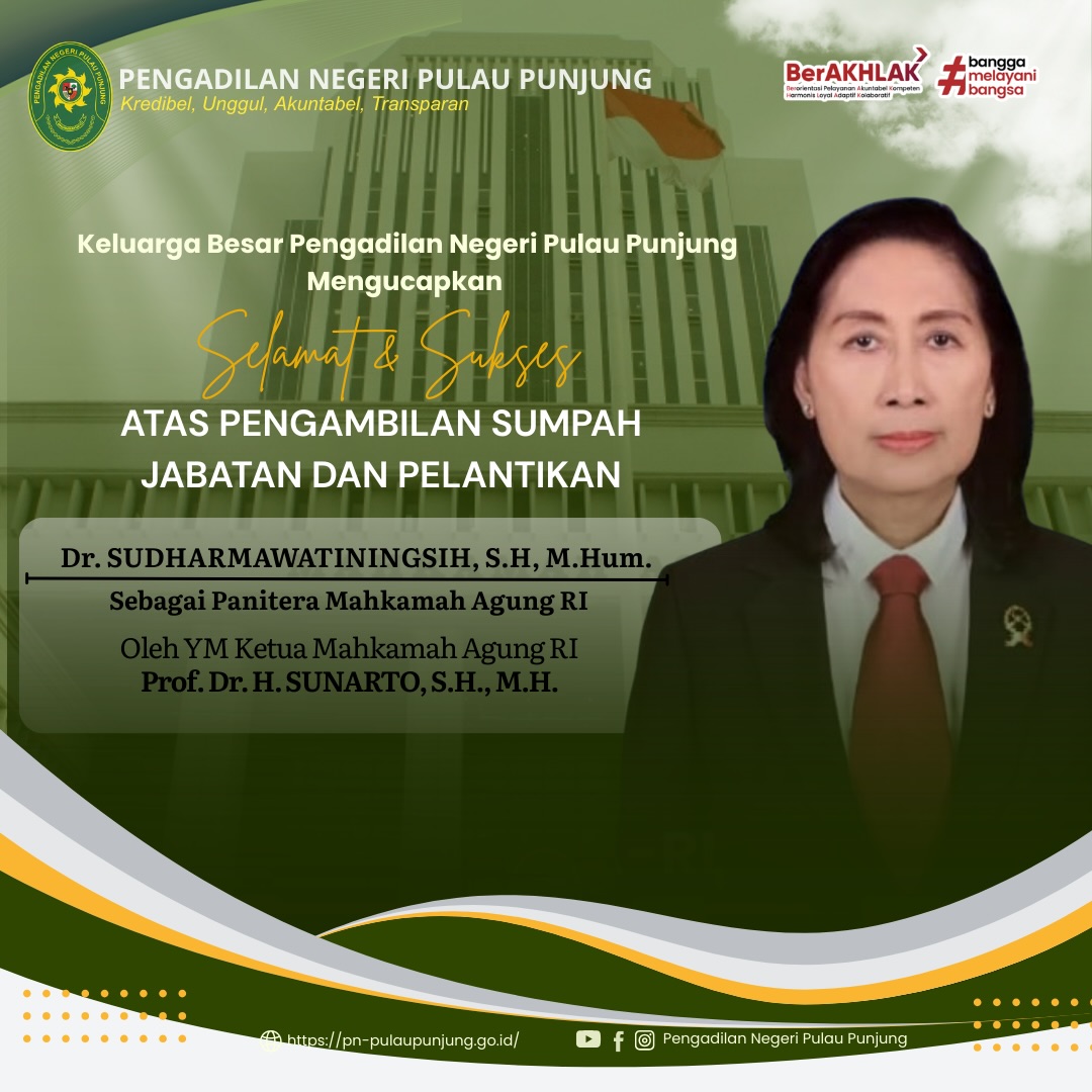 Keluarga Besar Pengadilan Negeri Pulau Punjung mengucapkan selamat & sukses atas pengambilan sumpah jabatan dan pelantikan Ibu Dr. Sudharmawatiningsih, S.H, M.Hum. Oleh YM Ketua Mahkamah Agung RI Bapak Prof. Dr. H. Sunarto, S.H., M.H. pada Jum’at tanggal 13 Februari 2026.