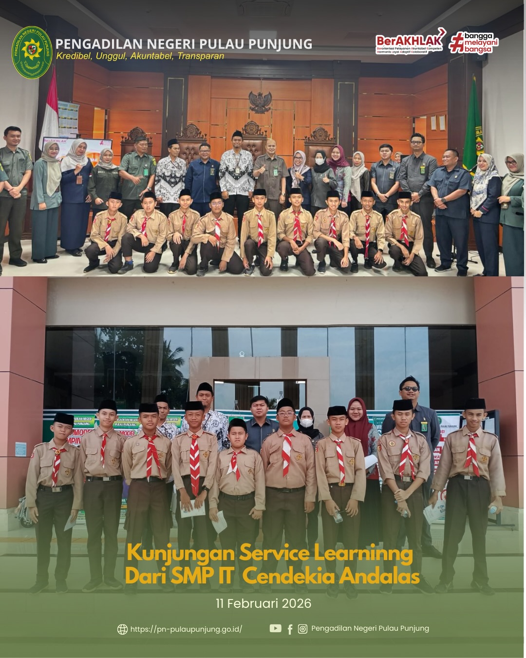 Pengadilan Negeri Pulau Punjung menerima kunjungan Service Learning dari SMP IT Cendekia Andalas sebagai bagian dari kegiatan pembelajaran di luar kelas yang bertujuan untuk menambah wawasan serta pengalaman nyata bagi para siswa.