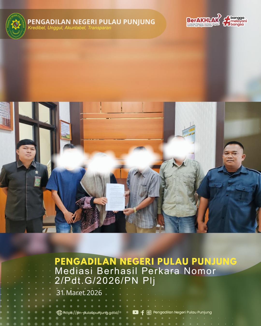 Selasa, 31 Maret 2026, telah dilaksanakan proses mediasi dalam perkara Nomor 2/Pdt.G/2026/PN Plj di Pengadilan Negeri Pulau Punjung yang berhasil mencapai kesepakatan damai antara para pihak.