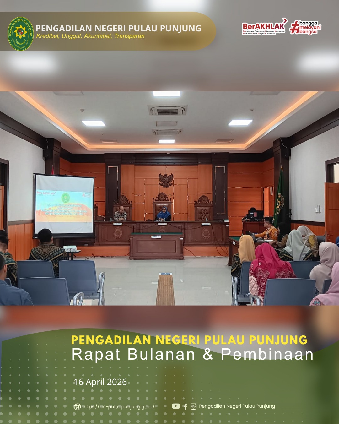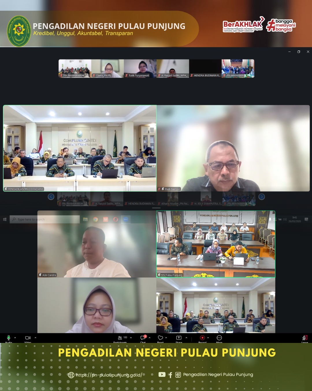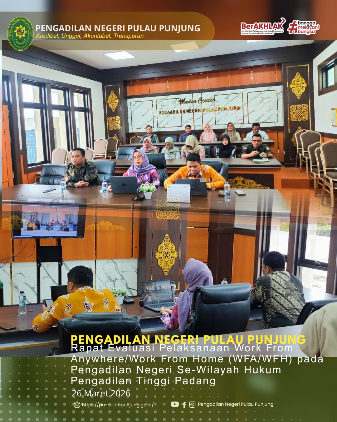 Kamis, 26 Maret 2026, Pengadilan Negeri Pulau Punjung mengikuti kegiatan Pembinaan, Pengawasan dan Evaluasi Kinerja terkait pelaksanaan Work From Anywhere/Work From Home (WFA/WFH) yang diselenggarakan oleh Pengadilan Tinggi Padang secara daring melalui Zoom Meeting.