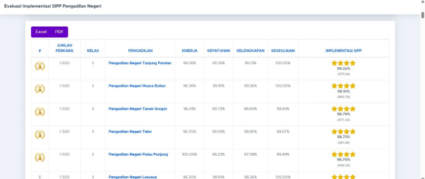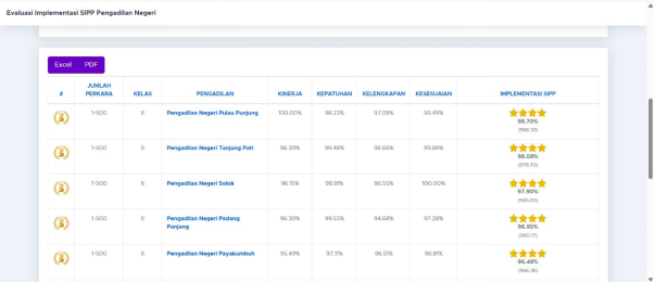 Nilai capaian EIS yang diraih mencapai 98,70%, yang mencerminkan kinerja optimal dalam penyelesaian perkara, minutasi, hingga unggahan putusan melalui Sistem Informasi Penelusuran Perkara (SIPP). Ini menjadi bukti nyata bahwa digitalisasi sistem manajemen perkara benar-benar diimplementasikan secara konsisten dan efektif oleh jajaran Pengadilan Negeri Pulau Punjung.