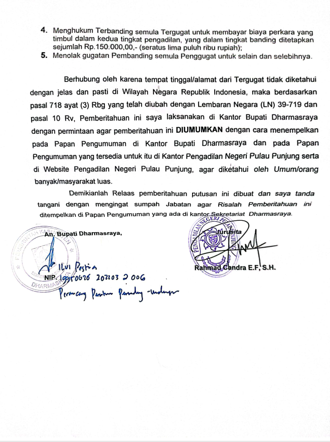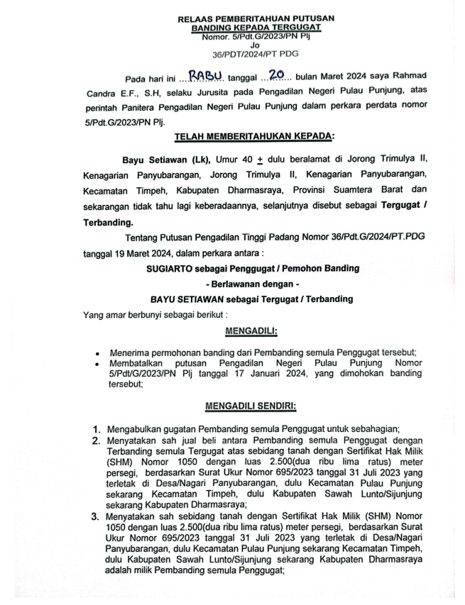 RELAAS PEMBERITAHUAN PUTUSAN BANDING KEPADA TERGUGAT Posted on 20 Maret 2024 Lihat Artikel Terkait Lainnya:Sosialisasi Pengadilan Negeri Pulau Punjung dan Ketersediaan Layanan Disabilitas Yang Bekerjasama Dengan SLB Negeri 1 Pulau PunjungSenin, 28 Juli 2025 —…Munggahan Menyambut Ramadhan Pengadilan Negeri Pulau PunjungKeluarga Besar Pengadilan Negeri Pulau…Pelantikan CPNS Menjadi PNS Pengadilan Negeri Pulau Punjung