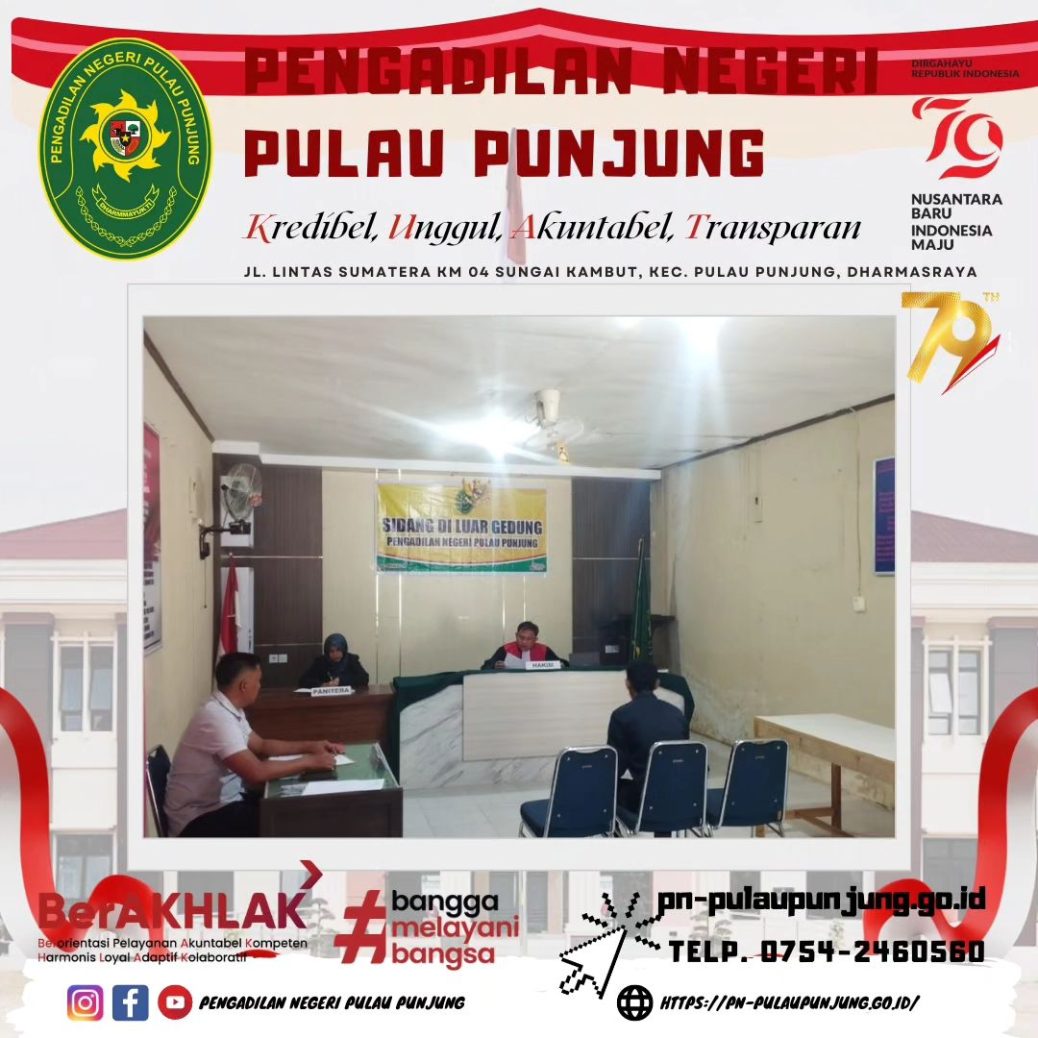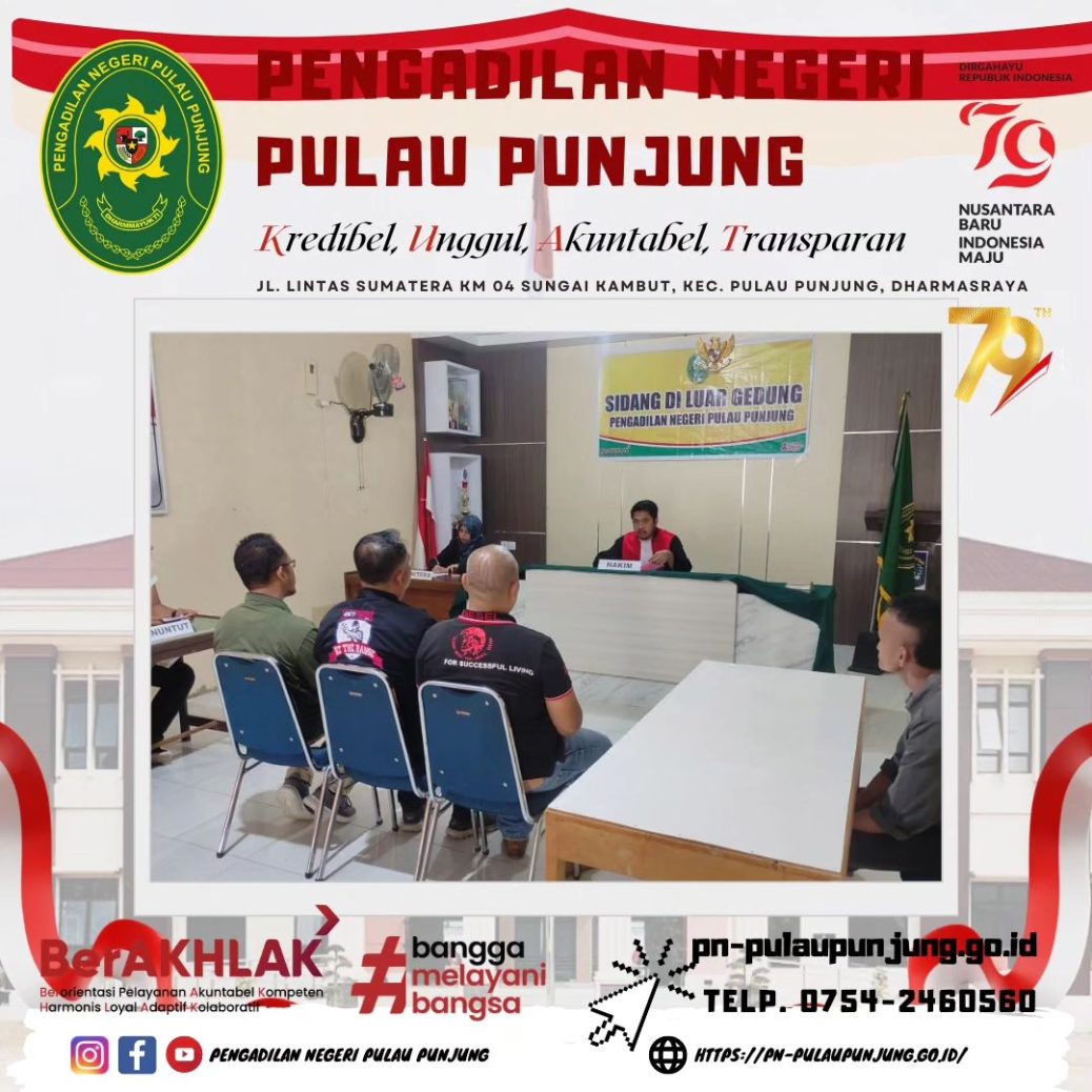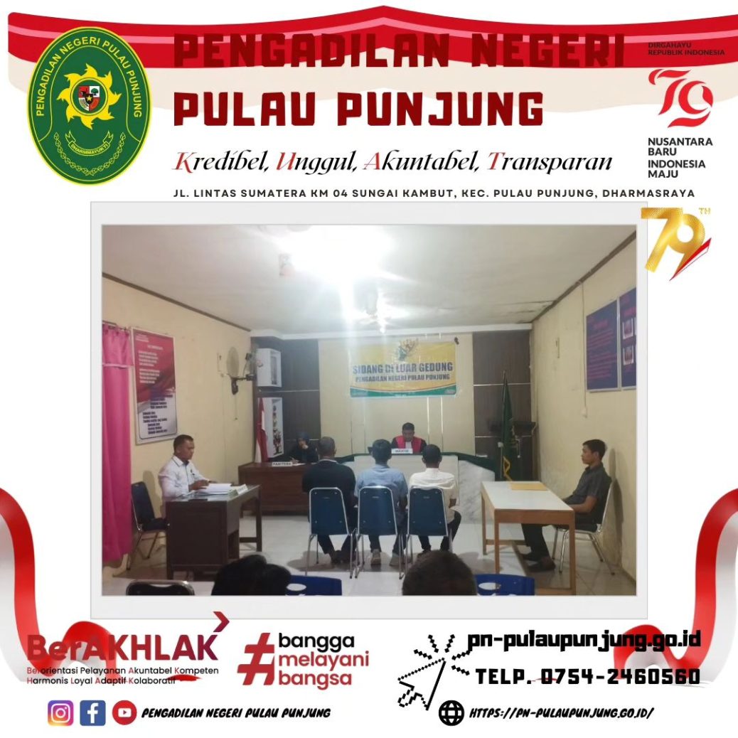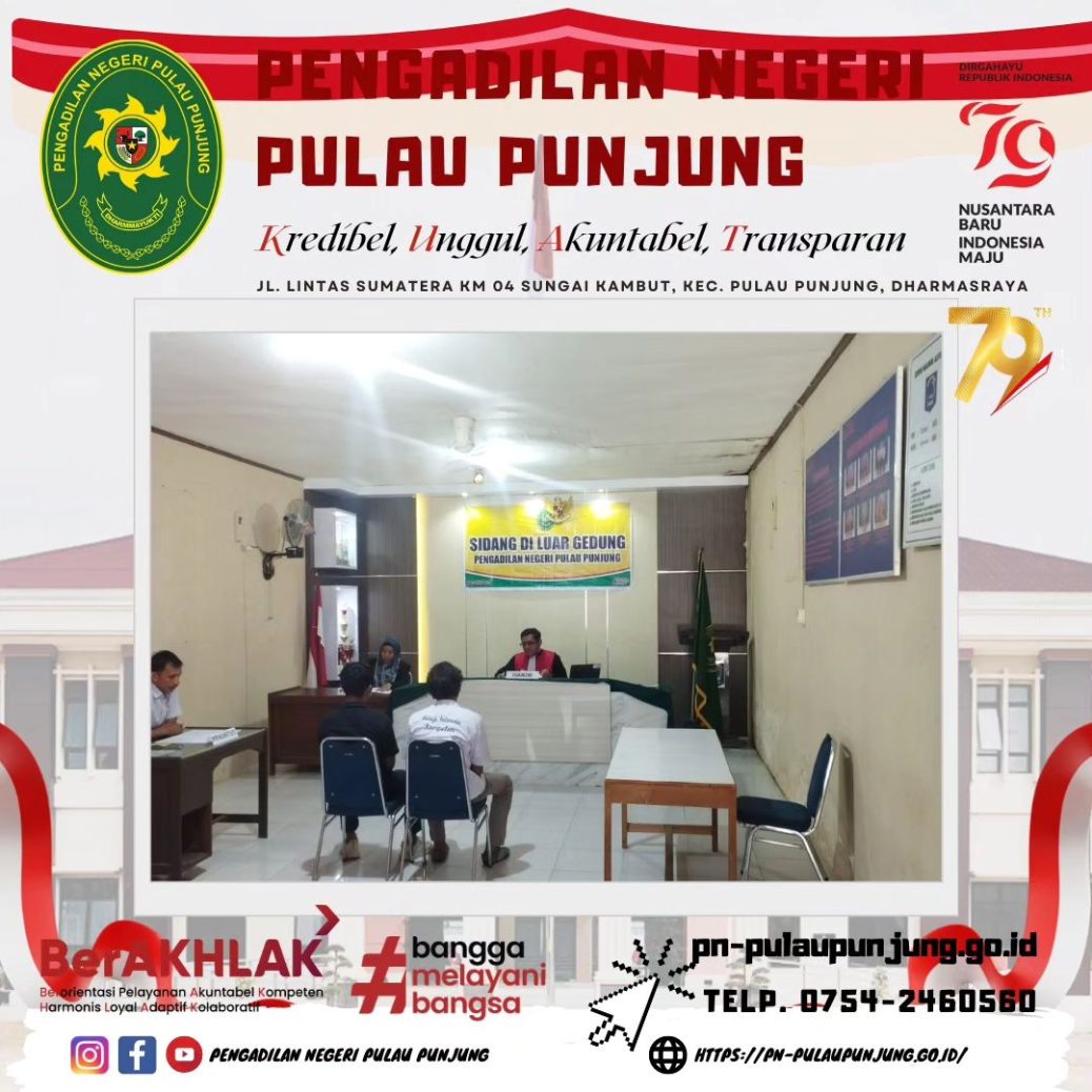 Dharmasraya, 26 Agustus 2024 Bertempat di Polsek Sungai Rumbai, Pengadilan Negeri Pulau Punjung melaksanakan Sidang Diluar Gedung. Sidang di luar gedung pengadilan merupakan salah satu layanan hukum bagi masyarakat sebagaimana diatur dalam Peraturan Mahkamah Agung Ri Nomor 01 Tahun 2014 yaitu berupa sidang yang dapat dilaksanakan secara tetap, berkala atau sewaktu-waktu oleh Pengadilan Negeri di suatu tempat yang ada di dalam wilayah hukumnya tetapi di luar tempat kedudukan gedung pengadilan dengan pertimbangan untuk memberikan akses yang seluas-luasnya kepada masyarakat.