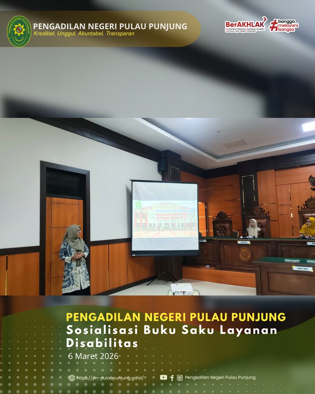 Jum’at, 6 Maret 2026, bertempat di Ruang Sidang Utama Pengadilan Negeri Pulau Punjung, telah dilaksanakan kegiatan **Sosialisasi Buku Saku Layanan Disabilitas** sebagai bentuk komitmen Pengadilan Negeri Pulau Punjung dalam mewujudkan pelayanan peradilan yang inklusif, ramah, dan memberikan akses yang setara bagi penyandang disabilitas.